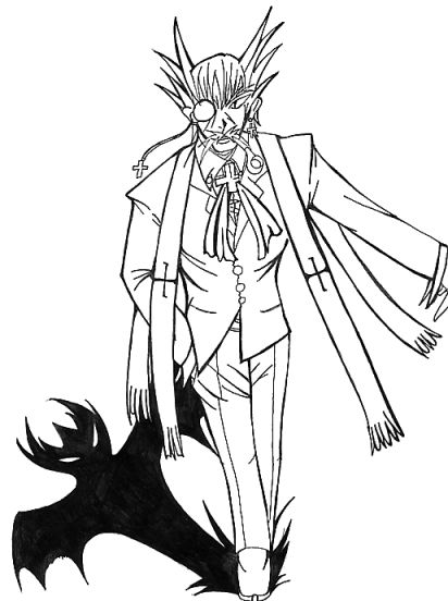 | ■外見 鉄拳の三島平八のような髪型 (ただ真ん中は禿ていない(w)で美しい銀髪、立派な感じの髭をたくわえる。 右に十字架のついた紐が下がった片眼鏡をかけ、常に銀色のパイプをくわえている。 十字架のようなネクタイを着け、燕尾色のジャケットに燕尾色のズボン、 袖には十字架のアクセサリーが飾られている。 両片にスレイヤーのような短いマントを羽織る。 ![]() |