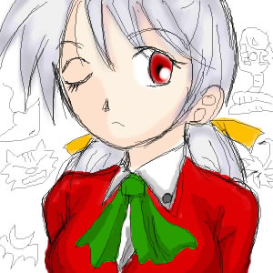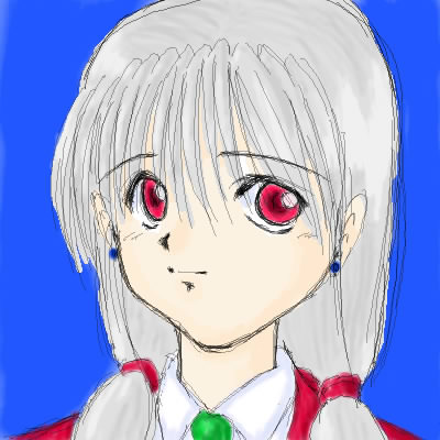 | ■外見 銀色の髪の毛を赤いゴムで二本に縛っていて、長さは背中ぐらいまである。 瞳の色は紅くて肌の色は白い(アルビノ)赤い制服のようなものを着ていて、 合い着は白くて胸元には緑色のリボンが着いている。 靴はローファーで、耳にはマグネットピアスをしている。 トルマリンのブレスレットと十字架のペンダントをしている。 大きなトランクを一つ持つ。 ![]() |