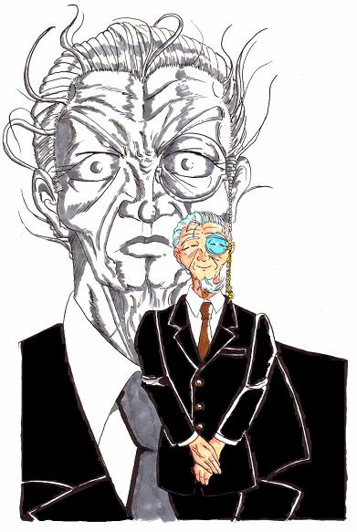 | ■外見 ダークスーツ姿でオールバックの白髪にややカールしたアゴヒゲ。 タレ目で左目に片眼鏡をしている。 |