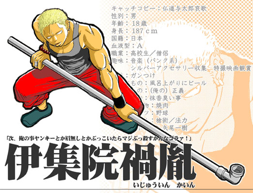 ■プロフィール ●伊集院禍胤● キャッチコピー:仏道与太郎哀歌 性別:男 年齢:18歳 身長:187cm 国籍:日本 血液型:A 職業:高校生 僧侶 趣味:音楽(パンク系) シルバーアクセサリー収集 特撮観賞 特技:ガンつけ 好きなもの:風呂上がりにビール 大切なもの:(俺の)正義 苦手なもの:抹香臭い事 好きな食べ物:焼肉 得意スポーツ:野球 格闘スタイル:槍術/法力 イメージボイス:矢尾一樹 |