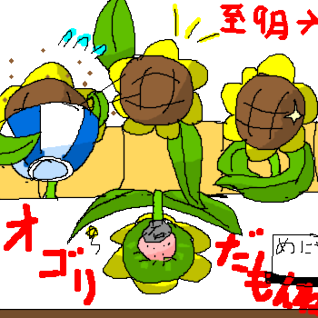 | ■ひまわり人間 真紀が作った小型ロボットたち。 『ファーガシリーズ』と呼ばれるロボットの第三段。 3とサン・フラワー(ひまわり)をかけてあるとか無いとか。 サン・フラワーゆえに、ひまわりという安易な外見であったりもする。 身長60センチ。体重5キロ。軽くて長持ち。 単純戦闘力ならば幼稚園児かそれに劣るレベルのものだが、 一方で『腕』が非常に器用で日常雑用にとても便利。 月の光ほどの明るさと水があれば、それのエネルギーで活動可能。 意外にも丈夫で潰されてもペラペラになるだけで、数秒もすれば復活する。 また、顔の種は採取すれば1週間ほどで再生する。 特化した人工AIを持っており、 それぞれのひまわり人間で違う人格を有している。 知能は小学生低学年程度のものであるが、喋ることも可能。 現在、200体近くまで増殖。日常面で非常に役に立っている。 意外にも燃えやすいので注意。 ![]() |