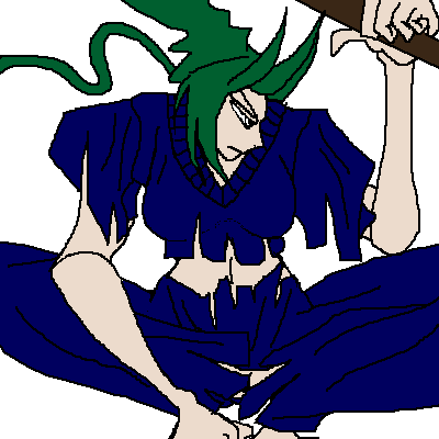 | ■外見 紺色の薄生地のセーターで、腹部中心ほどまでの長さ。 下も紺色でダブダブのズボンを履いている。セーター、ズボンともに 途中で敗れている。顔立ちはやたら引き締まっており怖モテな印象を感じる (本人に自覚は無い)。ボーッとしてるときの表情は、全てに対してガンつけしているかのような表情。 髪の毛は根元から後頭部にかけて重力に逆らうかのごとく尖って、いろんな方向に折れている。 アクセサリー等は一切付けていないが、手にはナマの日本刀を持つ。 |