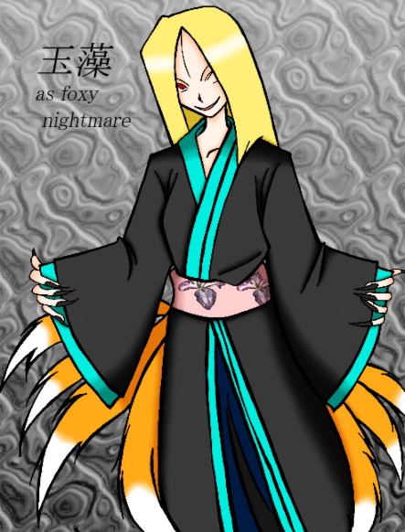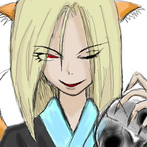 | ■外見 見た目は二十歳代後半の絶世の美女。 冷やかな金髪を背中に流し、肌は雪のように白く、 妖しく輝く血色の瞳と濡れた唇が艶かしい。 狐の模様が入った漆黒の和服に身を包み、 水晶髑髏を抱いている(戦う時はどこかにしまっている)。 尻尾は普段は隠している。 一人称:妾(わらわ) ![]() |