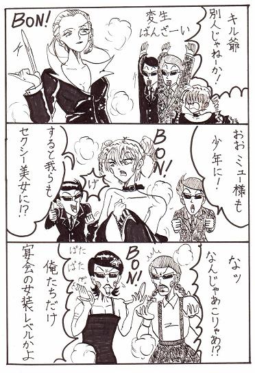 | ■秘技 『九尾雷刃』 1632143+P 「欲望の刃よ!」 地面から雷を帯びた真紅の九本の邪気の刃が天井に向かって伸びる。 出る前は隙が大きいが、出した後の隙は皆無。 ガードされても、相手より先に動ける。 『──変生せよ』 間合いでレバー1回転+P 「──変生せよ」 投げ技。相手を真紅の巨大な気で包み込む。間合いは広い。 一定時間相手は「性別」を逆転させられ、 身体に流れる陰陽の流れも逆流状態となり、 通常技しか出せなくなり、また「毒状態」で体力徐々に減少してしまう。 相手が変生している間は玉藻も必殺技は出せなくなる(通常技オンリー) ![]() 例:「−−変生せよ」をガーディアンズがくらったら‥‥ キルマー、片眼鏡がヘッドホンマイクになってます。 ミューは男になりパンチは使えなくなりますがキックの攻撃力はUP。 ブラックグラスは変生中、ずっと スポンジ、口紅、マスカラなどで絶えずお化粧しています。 攻撃はレッドグラスが中心。弱体化著しいです。 (イラスト:ホッパーの手記さん) |