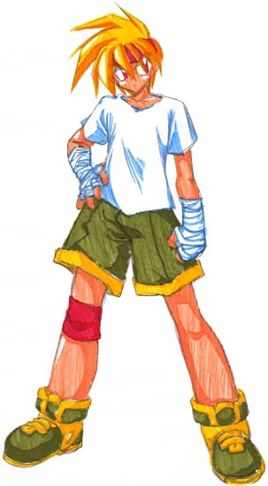 | ■外見 小柄だがスポーツ少年らしい引き締まった体。 とはいえ少年らしくまだ胸板は薄く手足も細く、 華奢な印象は否めない(線が細いと言うわけではないが)。 日に焼けた肌にぼさぼさと無造作に伸びた、父譲りの金髪が映える。 いかにも負けぬ気の強そうな、大きくつりあがってとんがった目と眉、 瞳は赤に近い茶。 感情の起伏が激しく、大袈裟に変化する表情。 印象としては生意気で気の強い悪ガキといった感じだろうか。 カーキグリーンのショートパンツ(膝上10cm程度)に 白Tシャツ(裾を出す)、濃緑のベスト。 拳にはいわゆるオープンフィンガーグローブ(ナックルガード)、 足元は裸足ではなくバッシュぽいものを履く。 長い前髪をどけるため、幅広の真っ赤なバンダナを巻く。 |