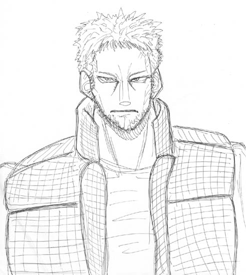 | ■衣装&外見設定 白いYシャツに防弾チョッキを重ねる。下は青いジーンズに革靴。 天然白髪に無精髭のハードボイルドな風貌を持つ。 |