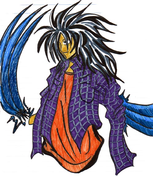 | ■外見 ヴェージュのボロいTシャツの上に紫に灰色の縞模様の入ったシャツ。 灰色&黒&白が入り混じった無造作ヘア。 |