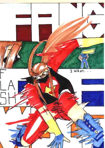 ■Profile 名前:フラッシュ(本名不明) 性別:女 年齢:不明(見た目は30代くらいに見えるが世界崩壊前 の生き残りと言う事で実年齢はもっと上だと 考えられる。) 身長:170cm 趣味:なし 好きな物:不明 嫌いな物:不明 性格:口数が少ない(記憶を失う前は明るい性格だった らしい) ターゲットキャラ:イズナ 容姿 均衡のとれたスレンダーな身体、茶色の長い髪を後ろ で束ねている、黒い覆面をしていてそこから見える目 は蒼眼である。服装は胸に黄色い星マークを付けた 全身タイツ、緑色の靴、黒のナックルガード。 |