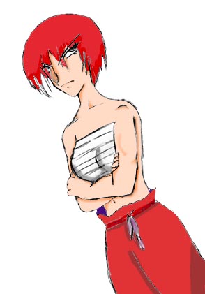 ■プロフィール 名前:北条あずみ 性別:女 出身:日本 流派:自己流喧嘩殺法 生年月日:9月16日 年齢:22歳 血液型:O 身長:179cm 体重:62kg 好きな物:喧嘩、闘ってる瞬間、焼そば 嫌いな物:勝手な理屈、退屈 性格:普段は無口で無愛想、以外と滅多に怒らないが 切れると恐いらしい、以外と頭が切れる。 容姿 顔はすっきりとした感じでつり気味の目と眉、 ボサボサの赤い短髪、鼻の上に5cmくらい の傷、右の歯が一つ欠けている、 肉体は引き締まっていて無駄が無く、大小様々 な生傷がある、服装は特攻服のズボン、胸にさ らしを巻いている、裸足、右手に木刀を持っている。 |