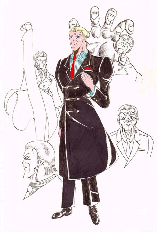 | ■外見 白人中年男性。長身にブロンドをオールバックにしている。後ろ髪が少し長い。 カミソリの様に冷たく鋭い目、猪木ばりの長いアゴと太い首。 服の下はかなりの筋肉質。 笑みはカメラの回っている時や演説の時くらいしか浮かべない。 ダークスーツ姿だが背広は特注品でコート並みに長く、 その裏地には耐火防弾加工が施してある。 |