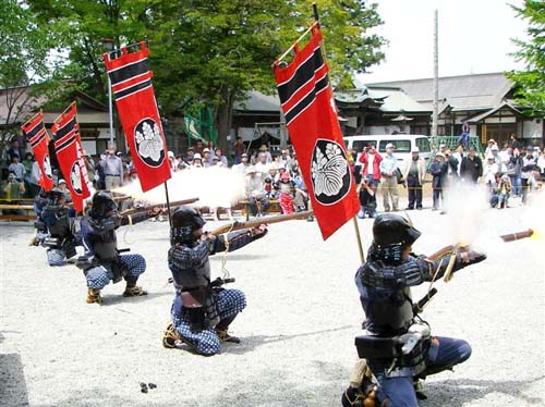 写真は城の庭にて火縄銃を打つ鉄砲隊。