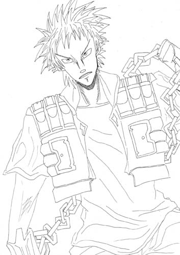 | ■衣装&外見設定 肩口にベルトを3つ通した短めの変形学ランの下に、青いTシャツを着る。 下は黒いズボン。両腕は武器として内部に「チェーングレネード」を収納している。 |