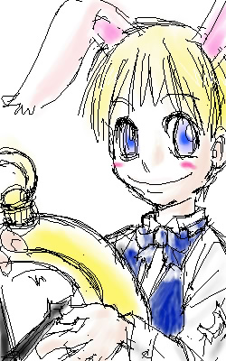 | ■衣装&外見設定 ふわふわとした金髪に碧眼、身長こそ小さいが北欧系白人らしい美少年。 芸の為もあるがいつもニコニコとして明るく愛想が良い。 セルリアンブルーのベスト、同色のズボン、赤いネクタイ、 白い大きなシャツ、白スニーカー。 服はいずれもサイズが大きく体に合ってない様な感じで、シャツの袖と ズボンの裾はまくってたくしあげられている。 何故か白いウサギの耳をつけ、ベルトから大きな金時計をぶら下げている。 |
