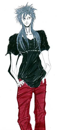 | ■衣装&外見設定 真っ黒の模様無しのTシャツに赤いジーンズを穿く。 髪の毛は灰色で中心部を固めて何本かに分けている。 「大気」と「重力」を意のままに操る事ができる能力を持つ。 |